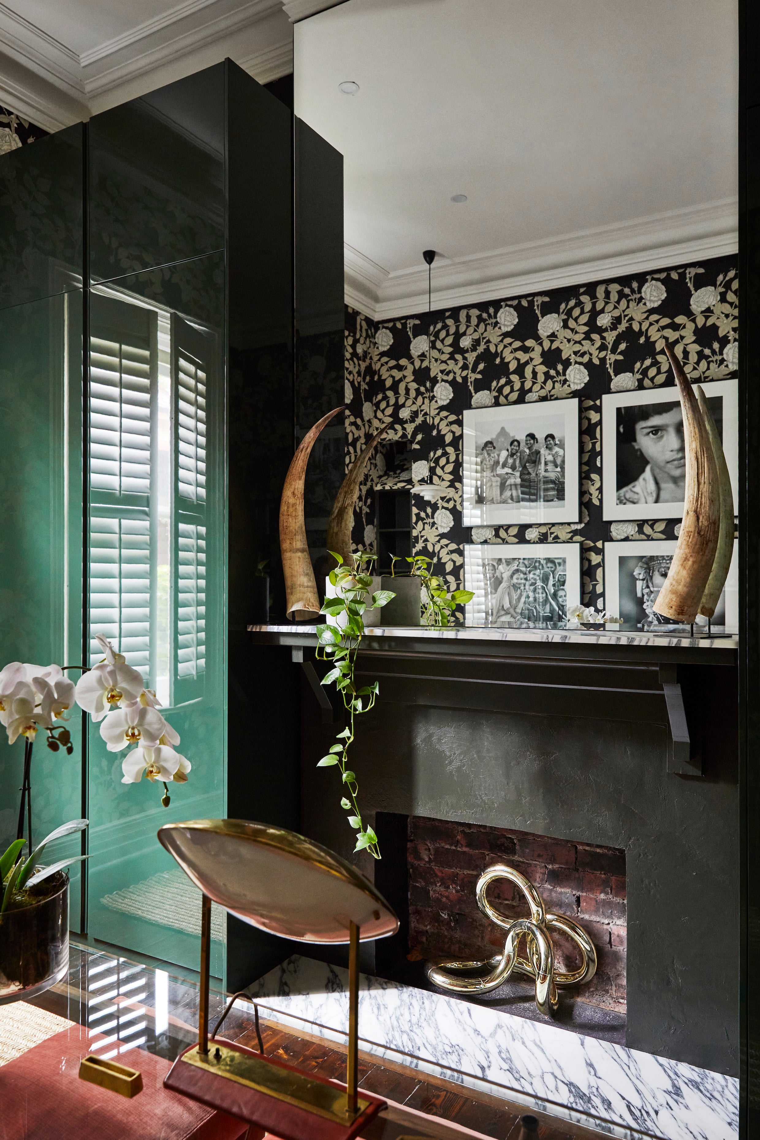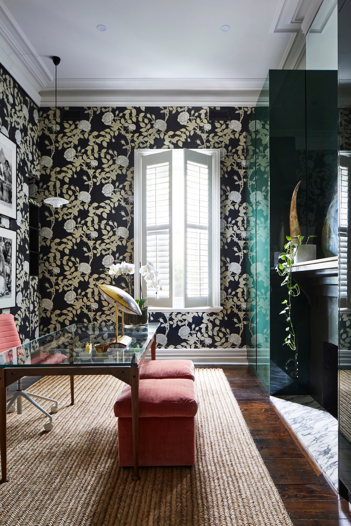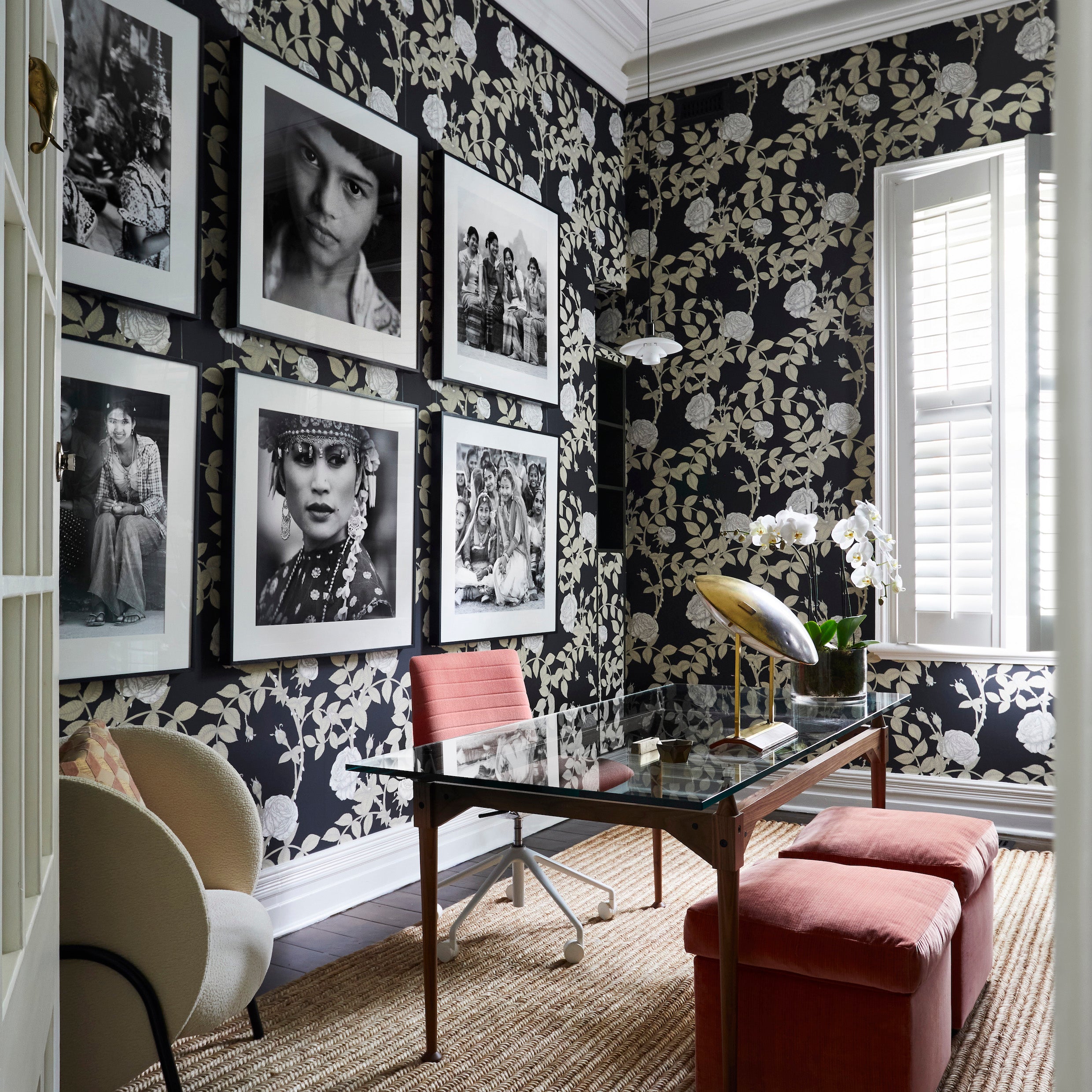 For the home office, the brief was sophisticated, feminine and functional. Black and white McGean Rose wallpaper sets a dynamic backdrop, both sharp and romantic, against which sculptural furniture, sleek joinery and bold photography come to life. It is a space designed to energise and inspire.