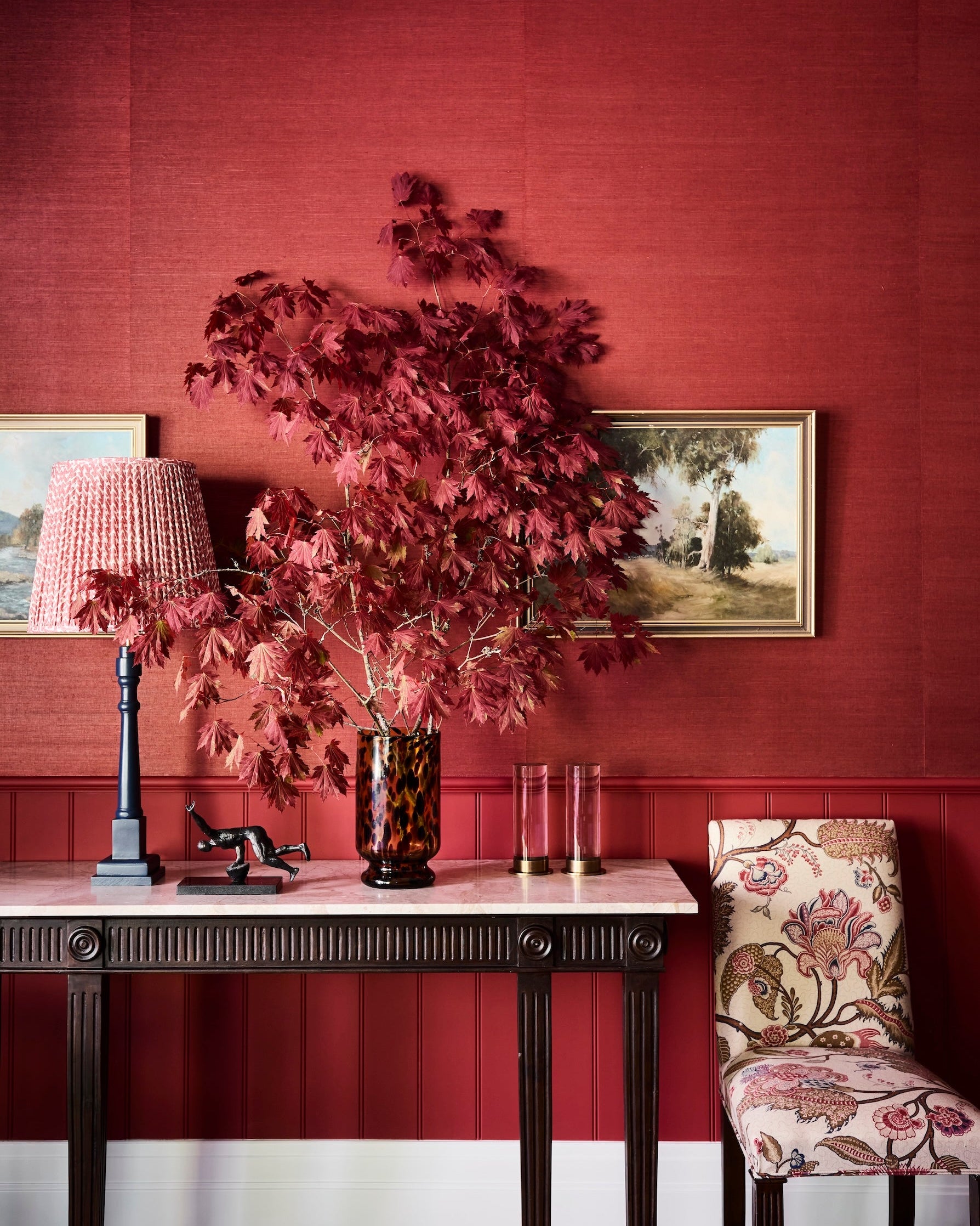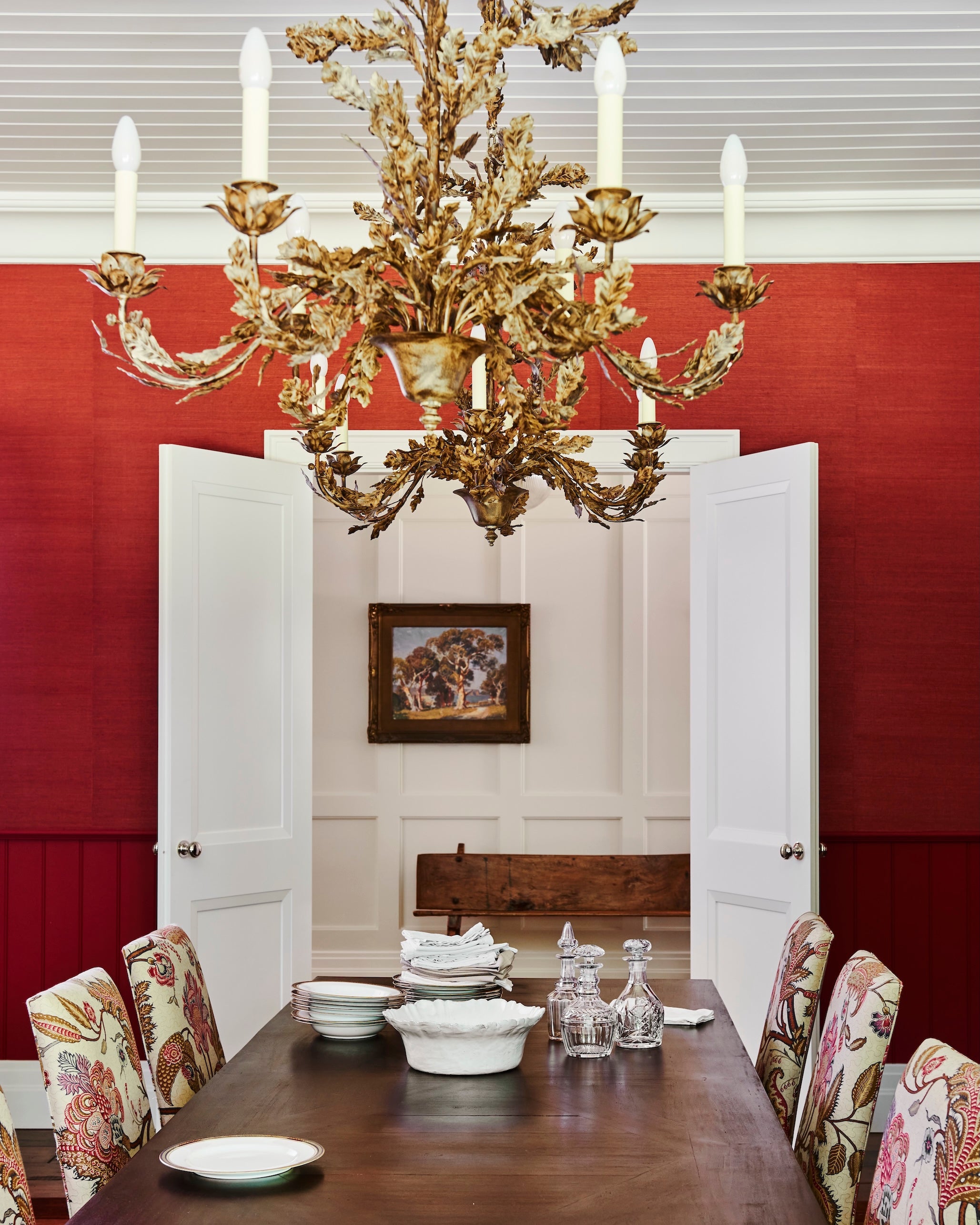 hidden jewel enveloped in deep red grasscloth and panelling. Here, our bespoke fourteen-seat table sits beneath oak-leaf chandeliers, their organic forms echoing the motif of the dining chairs and softening the richness of the space. This cocooning room invites gathering, celebration and conversation.