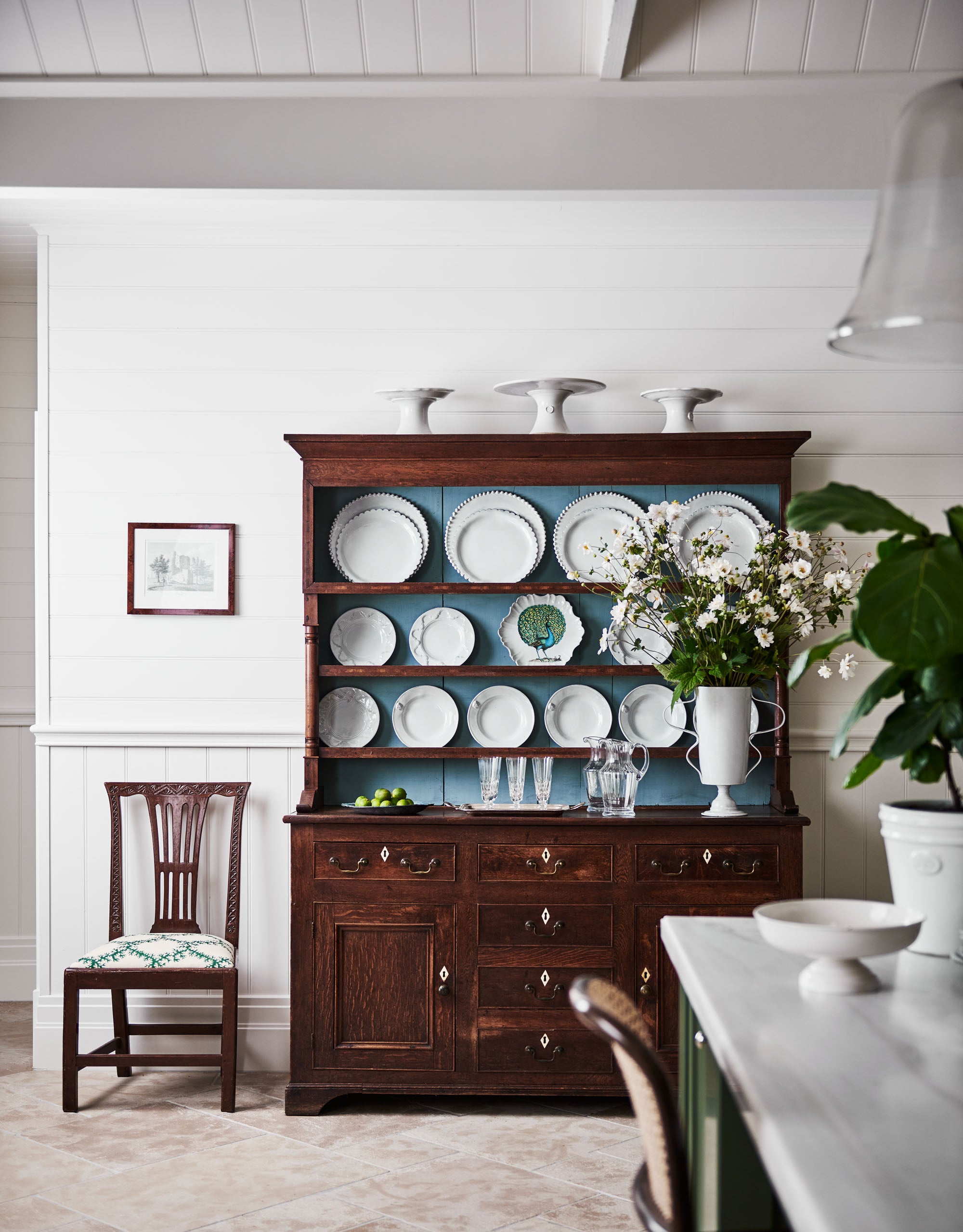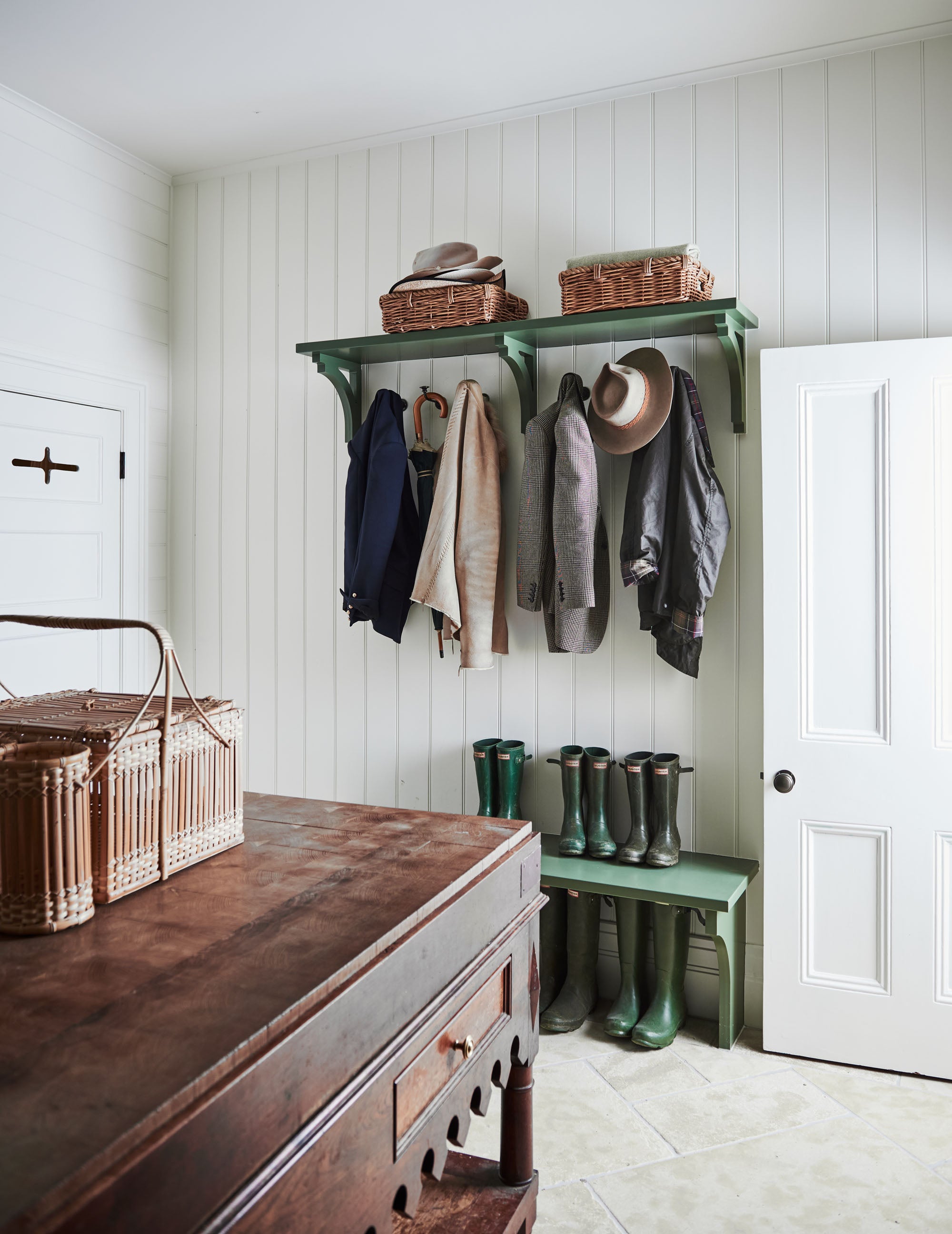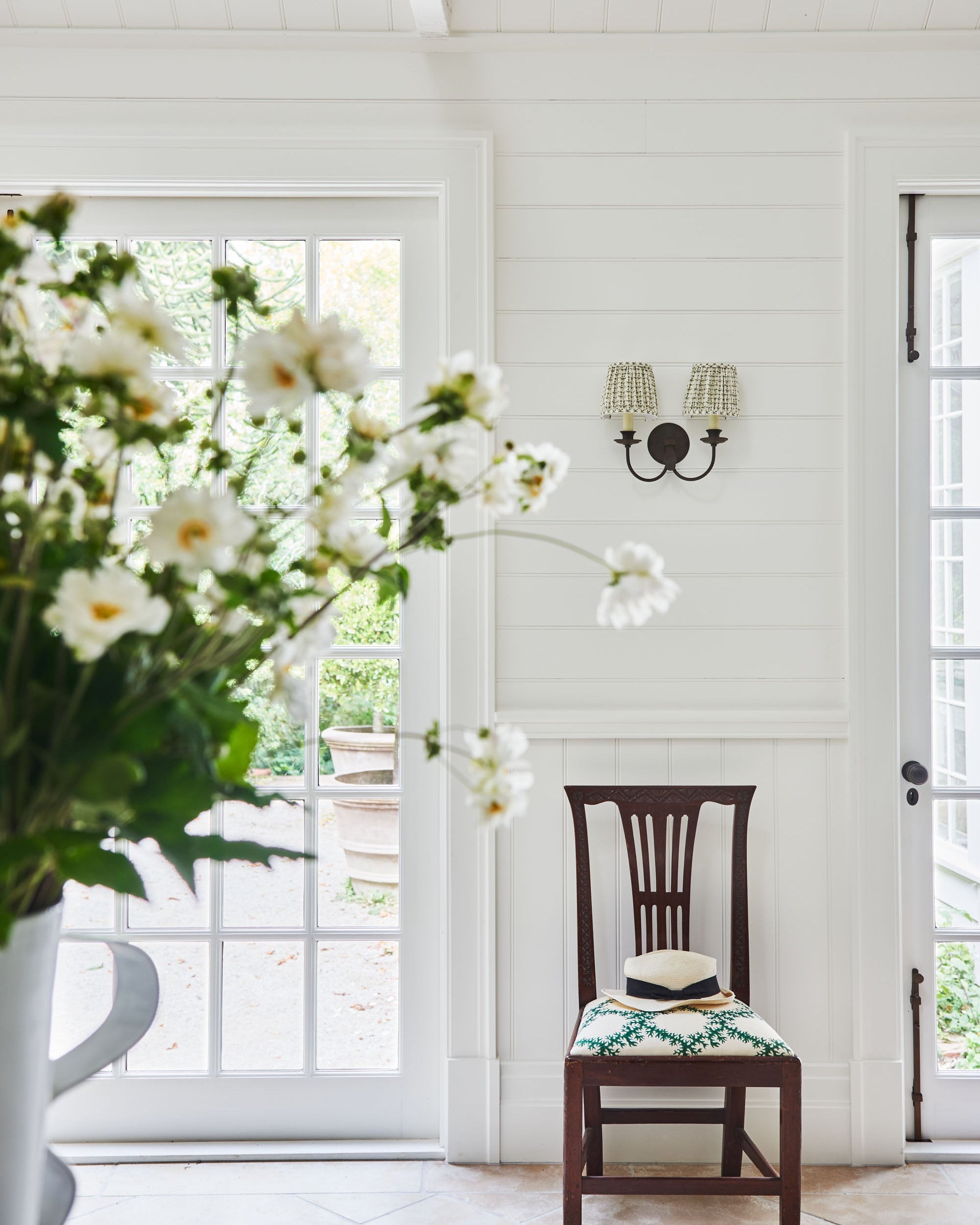 What was once an unused garage has been transformed into a double height country kitchen, flower room and powder room, creating an entirely new wing of the home that is now the heart of family life. Working within the original footprint, we embraced every angle and quirk of the space to design interiors that feel generous and elegant while being highly functional.