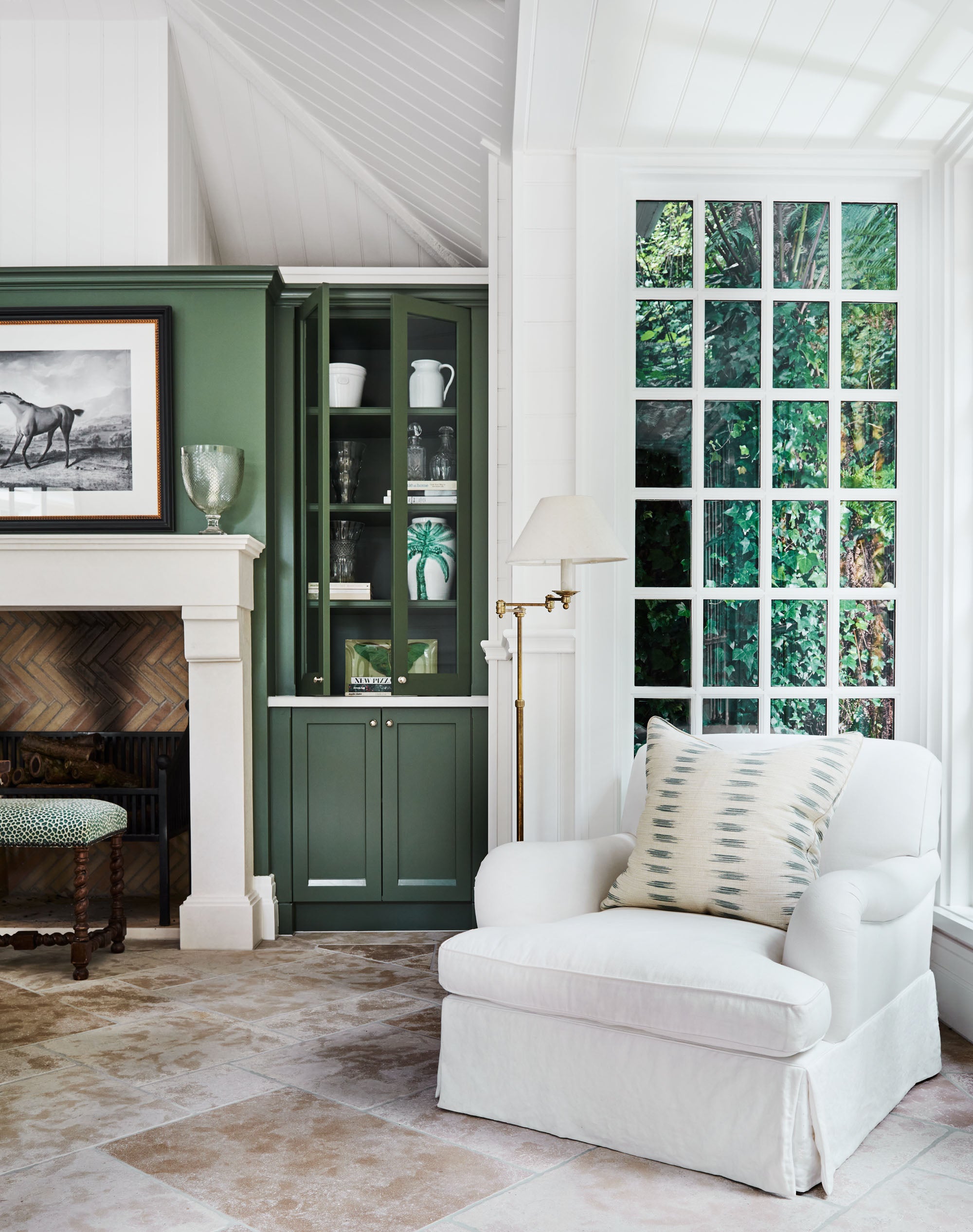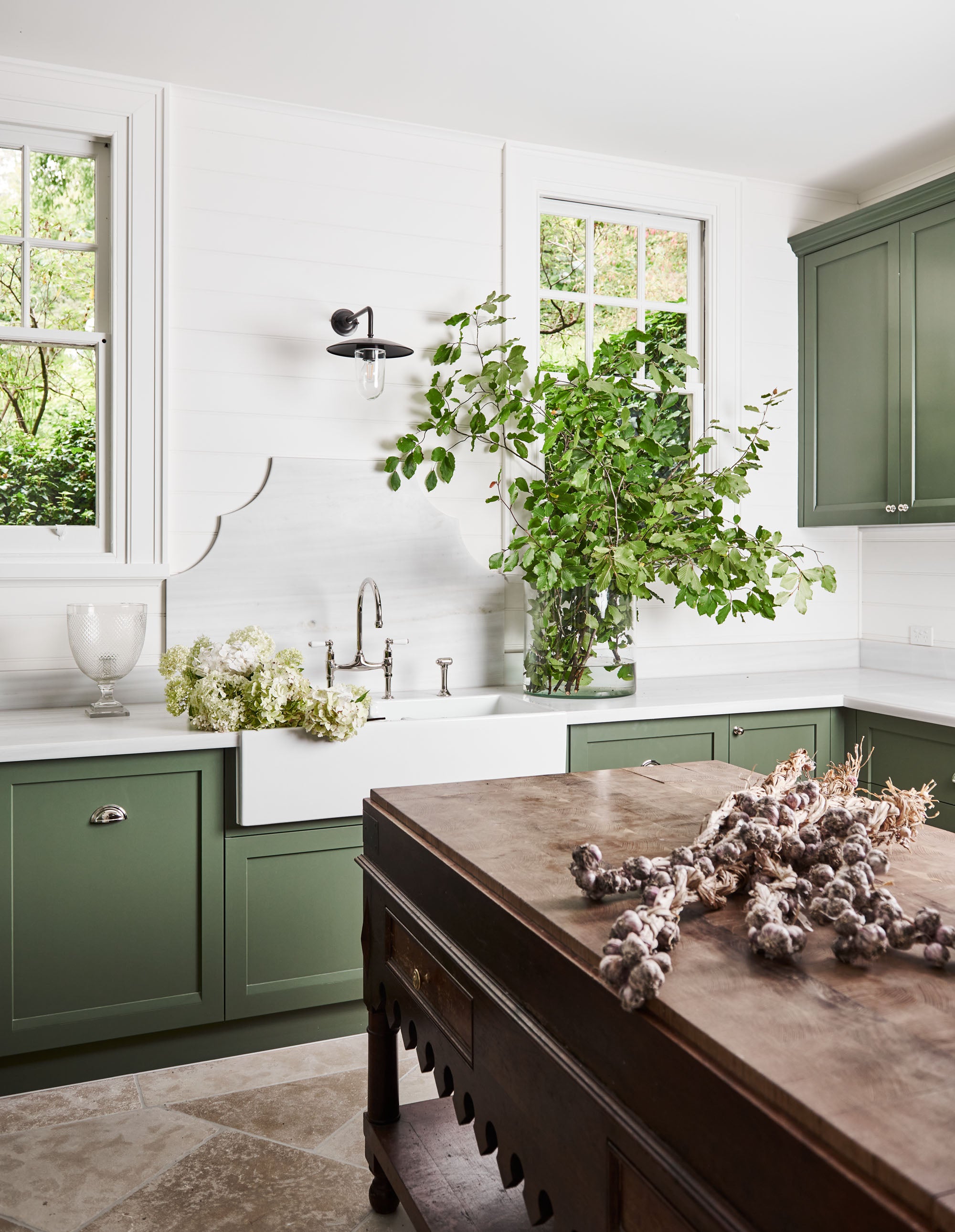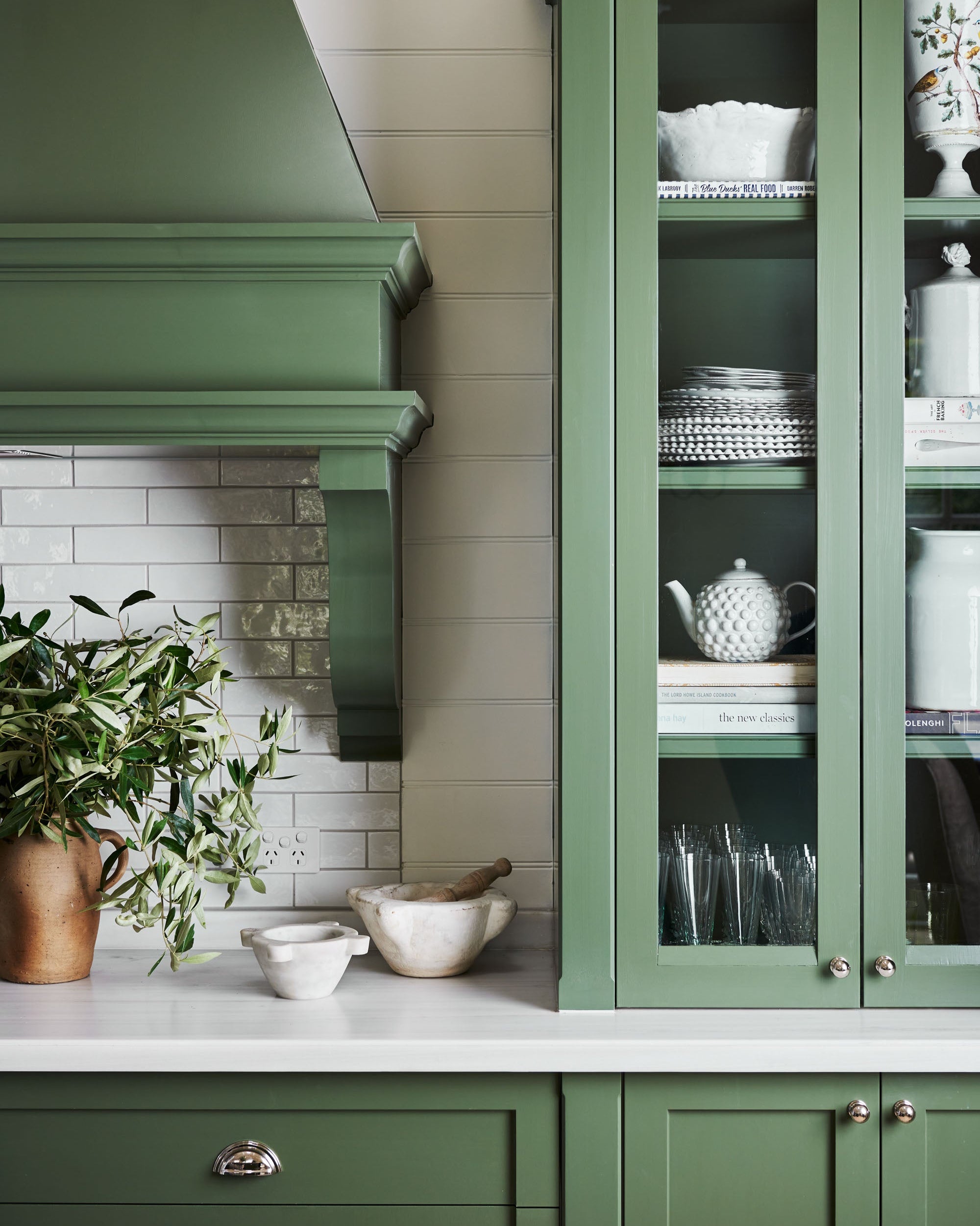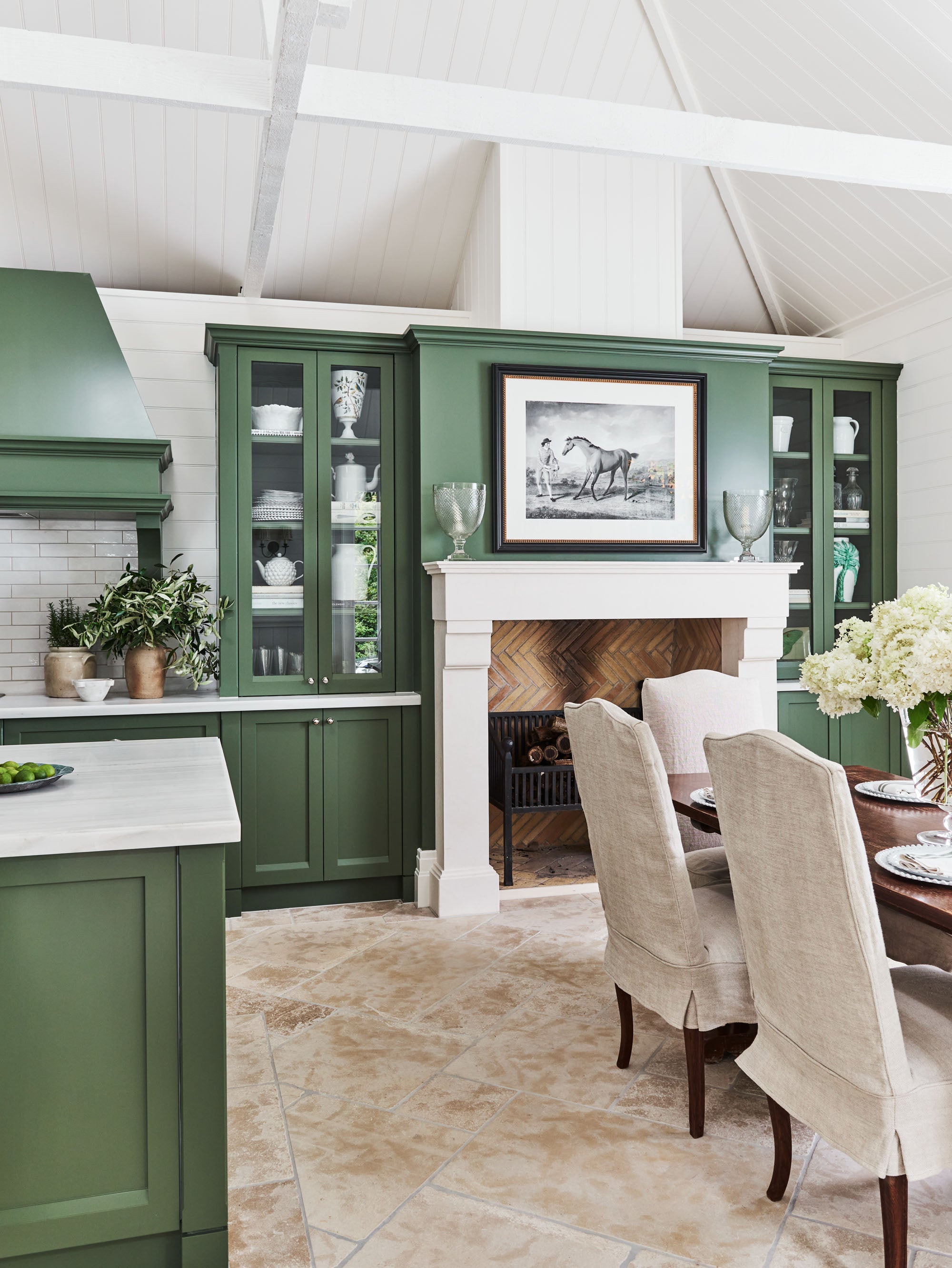 The palette draws directly from the idyllic country setting. We literally picked leaves from the garden to land on the perfect green for the joinery, which rests on limestone pavers that ground the room with natural elegance. Decorative lighting and antique furniture add layers of character and history, giving the new space a sense of timelessness.