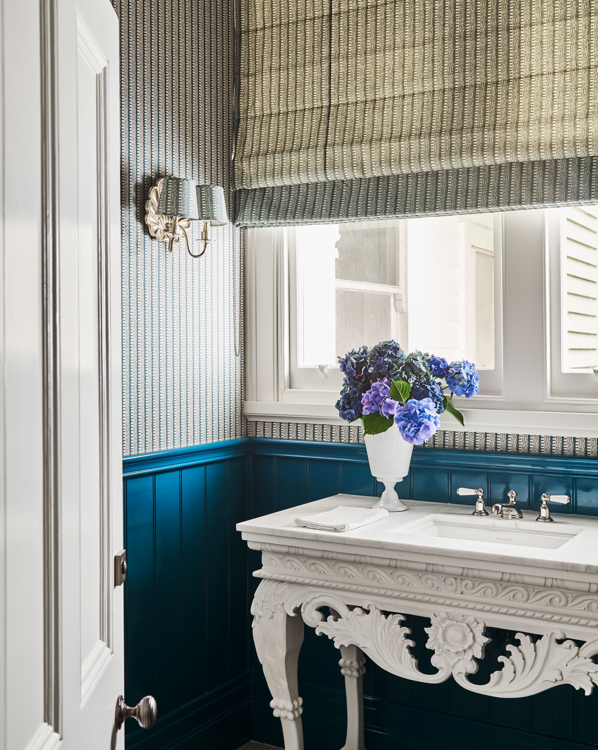 The powder room was conceived as a moment of surprise and glamour. Dark gloss walls and ceiling contrast with lineal wallpaper and blinds, creating a jewel box effect. A bespoke Lismore console was reimagined as the vanity, its decorative detail standing in playful contrast to the dramatic walls. Antique silver shell lights and an Irish mirror complete the composition, continuing the layered design language of the home.