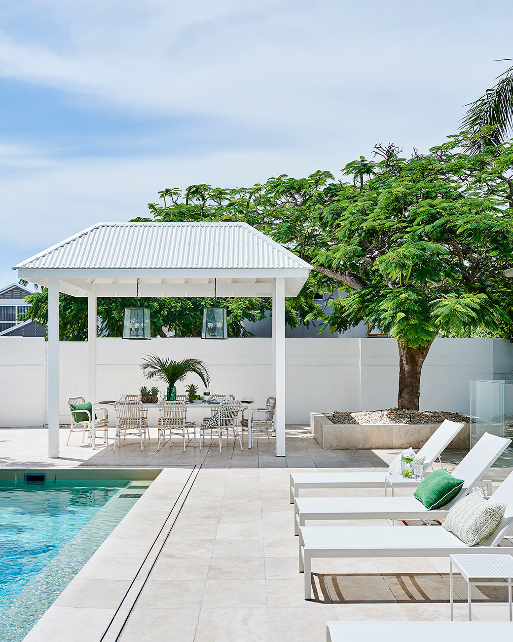 Outdoors, the entertaining area was completely redesigned with a new pool, travertine paving, and a bespoke undercover dining pavilion with a full outdoor kitchen, perfectly suited to long summer evenings with family and friends.