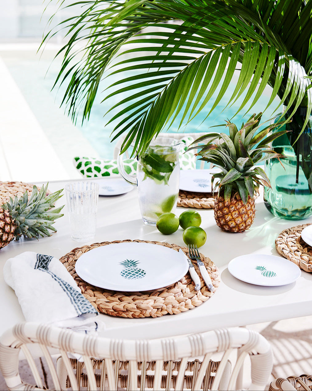 We crafted a design narrative around the pineapple, an enduring emblem of warmth and hospitality dating back to the 18th Century. As the residence plays host to several generations of a large family as well as friends from across Australia, the pineapple was a fitting motif to weave through the interiors. It appears in subtle ways, in our iconic lamps, in textile patterns, and even in joinery hardware. Extending beyond the furniture, we commissioned a bespoke porcelain dinner service and set of outdoor melamine plates adorned with the design. The result is a narrative that is at once playful and meaningful, a unifying thread that celebrates the tradition and spirit of welcome at the heart of this home.