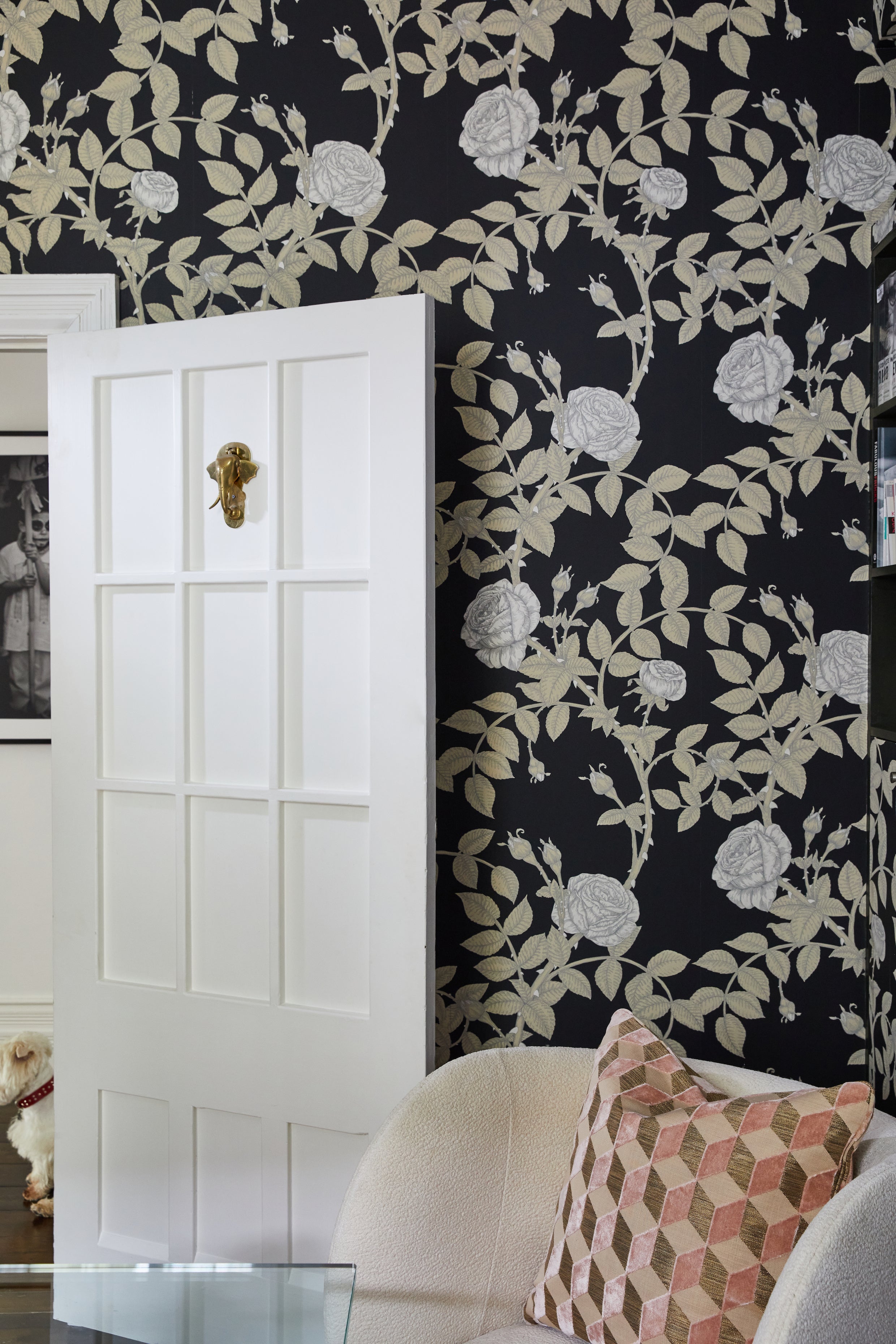 For the home office, the brief was sophisticated, feminine and functional. Black and white McGean Rose wallpaper sets a dynamic backdrop, both sharp and romantic, against which sculptural furniture, sleek joinery and bold photography come to life. It is a space designed to energise and inspire.