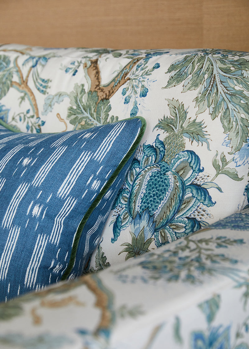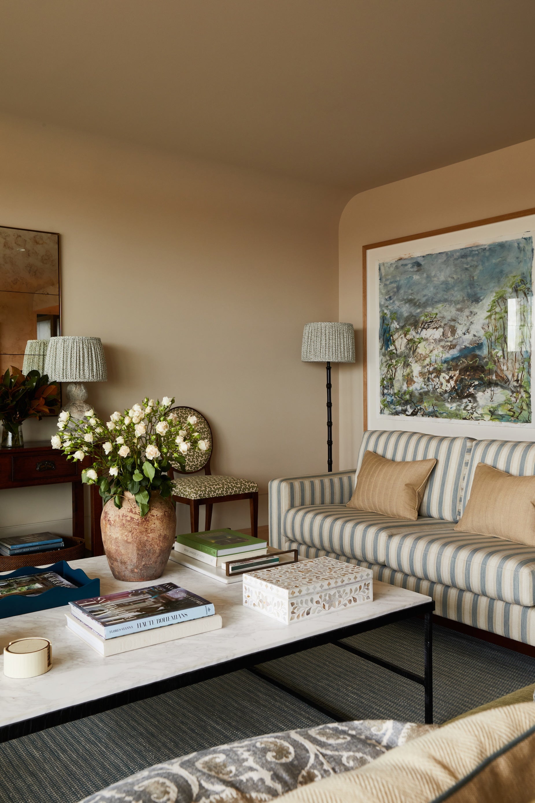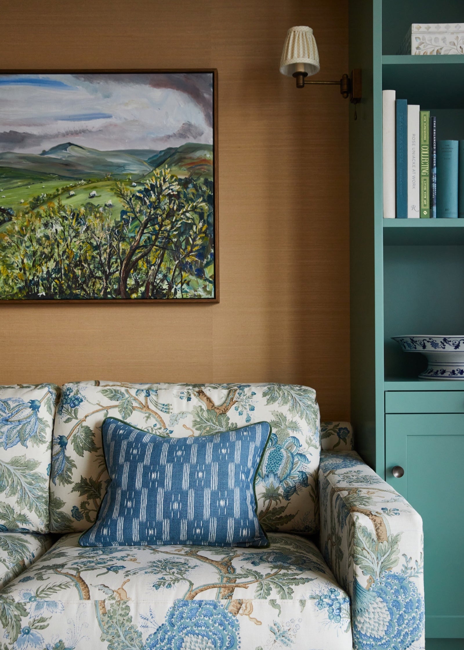 One of the most transformative elements of the project was the reimagining of an unused bedroom into a secondary sitting room. Designed as a quiet space for reading, retreat, or intimate conversation, the room centres around the Bennison upholstered sofa, perfectly nestled in our custom designed joinery. Colefax & Fowler grasscloth envelops the walls, creating an intimate, cocoon-like atmosphere that contrasts beautifully with the openness of the main living areas.