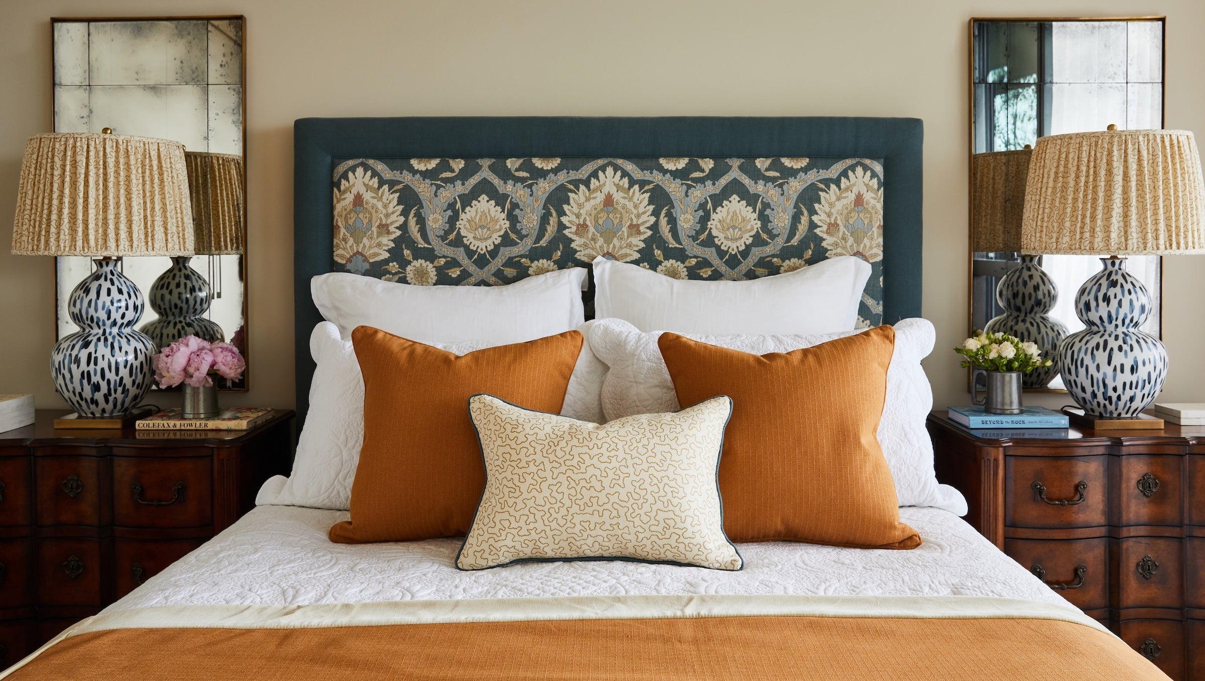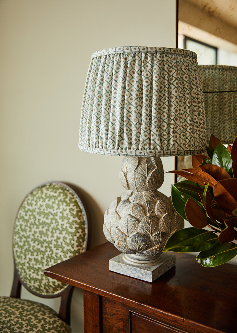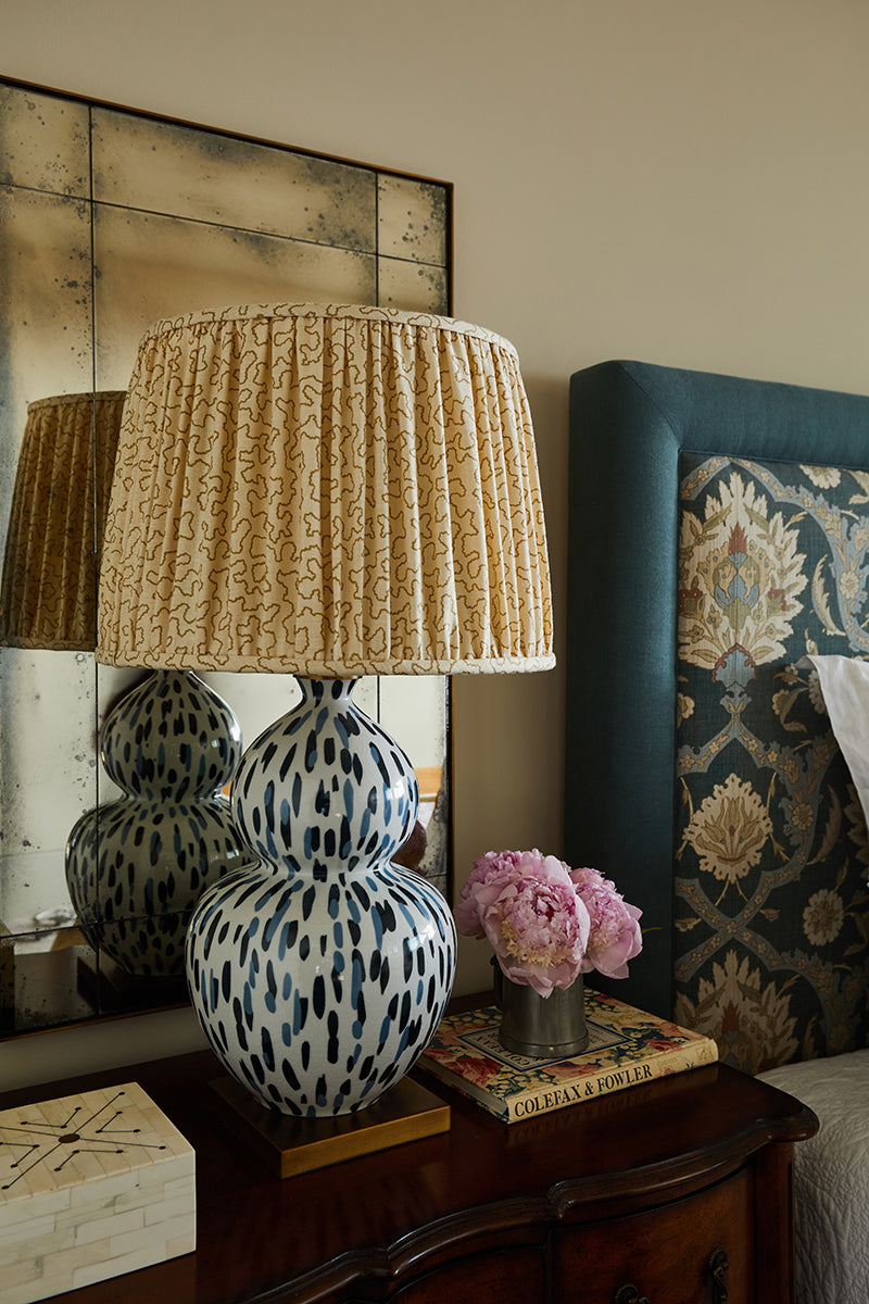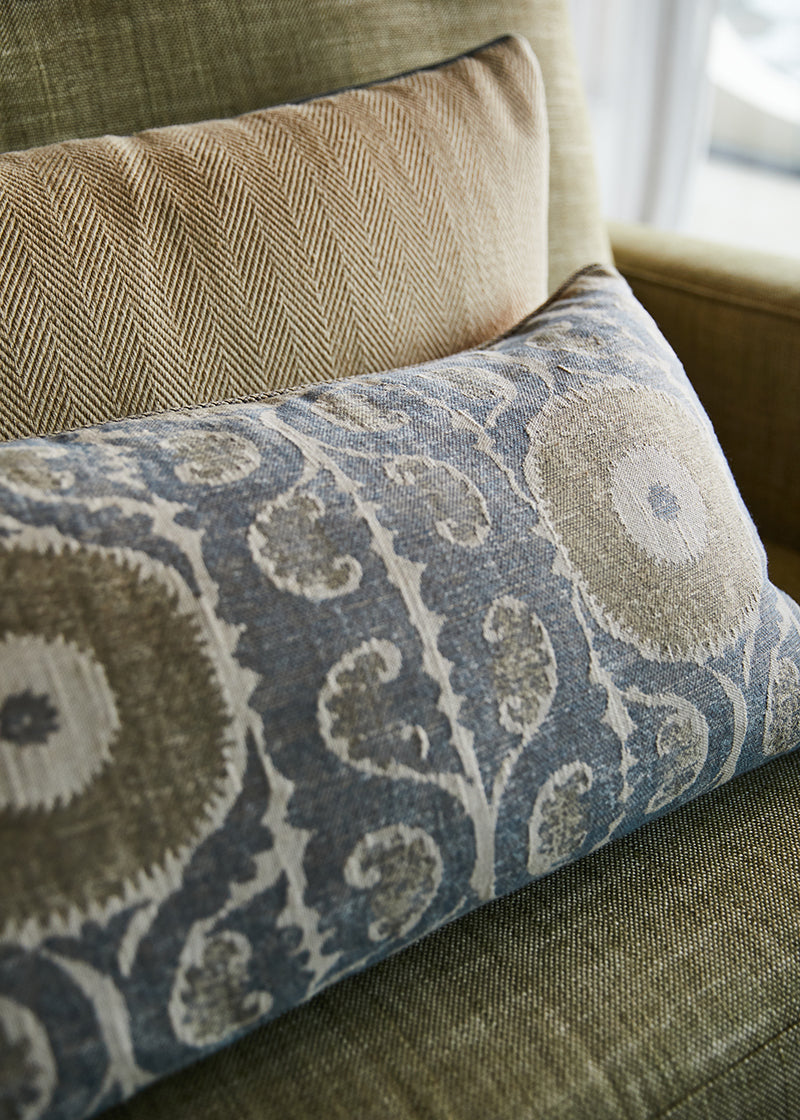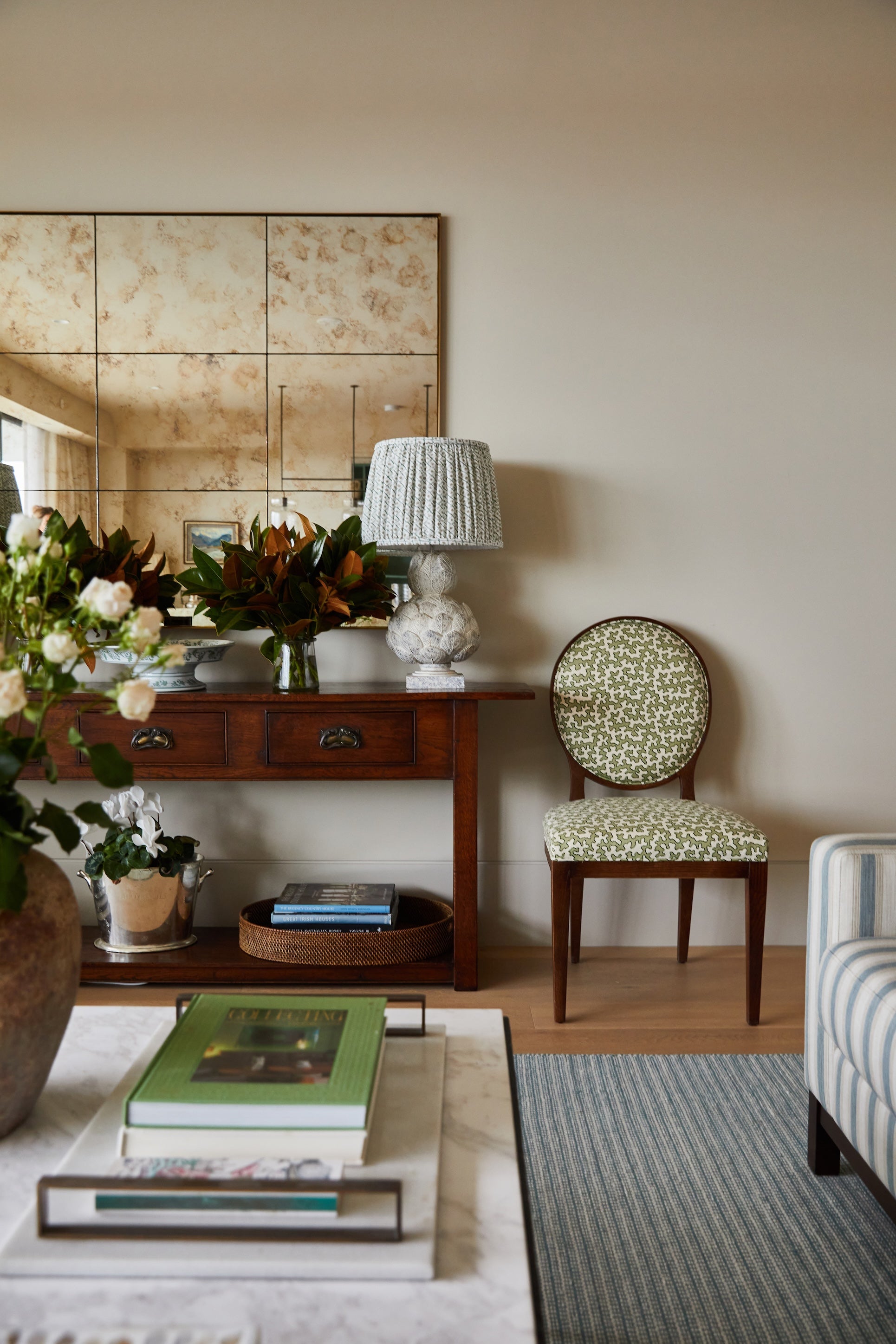 The colour palette blends pastel blues, olive greens, and warm neutrals, enriched with dark metal accents to bring depth and sophistication. Antique mirrored panels were introduced throughout to create visual interest, movement, and the illusion of greater scale, while artwork sourced for the clients further elevates the interiors. Classic botanical prints paired with bold, structural textiles create a chic balance between tradition and modernity. Anchoring the living room is a custom iron and marble coffee table, handmade by a local artisan, its weight and craftsmanship ground the space with permanence and artistry.